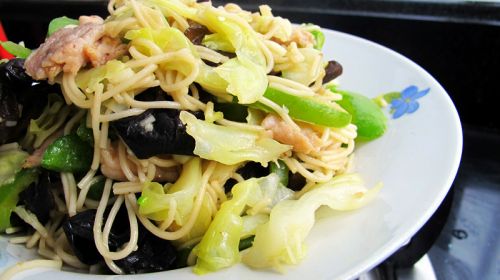 4. 放油,下木耳,放少许水焖,水快干时,倒入青椒,包菜,一同翻炒,加入少许盐。加入七成熟猪肉和面条翻炒,即可出锅