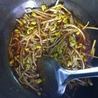 4. 加入黄豆芽进行翻炒 豆芽炒至半熟加入少许清水 或者高汤