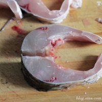 1. 把鱼清理干净去除鱼腥线后剁去鱼头和鱼尾。把中间这段剁成块。再把大的几块中间剁开分成两半。清洗干净。