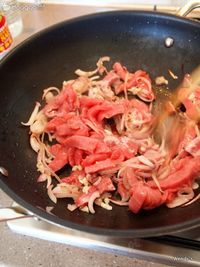3. 放入牛肉,均匀炒拌,直到肉变色。放入椰糖,盐调味。炒拌均匀,放入红辣椒片。炒2~3分钟