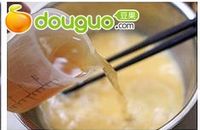 5. 用细致的漏勺过滤蛋液,倒入容器里。用勺子把蛋液表面的气泡除去,一定要除的干净蒸出来才漂亮。如果容器本身没有盖子,那就要用高温保鲜膜或者盘子盖着再蒸。
