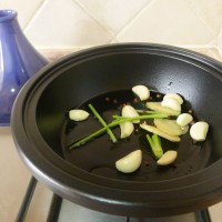 5. 塔吉锅内放油,烧热后,加入蒜瓣、香菜根、姜片,炒香。