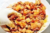 3. 五花肉切成厚片,调入腌汁拌匀,抓捏一下,腌制20分钟
