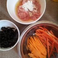 1. 里脊肉切丝,加淀粉,料酒腌制10分钟。干木耳泡发后洗净切丝。胡萝卜切丝,红椒切丝。
