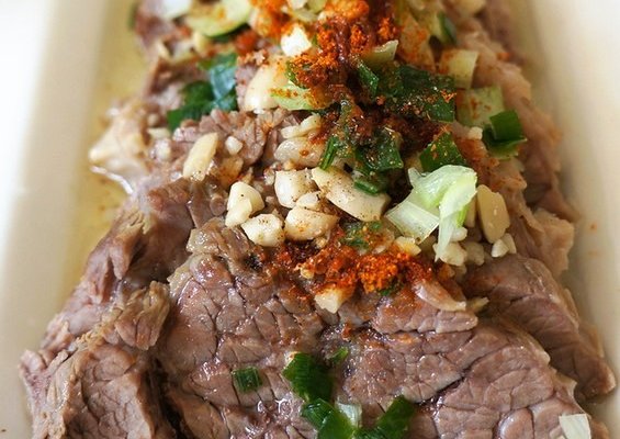 5. 熟牛肉切片后,装盘,倒一勺肉汤,上面撒一小勺细盐,一层花生碎,一层葱花,洒上辣椒粉和椒盐,倒一点香油,把加热过的香辣油浇在上面,OK。