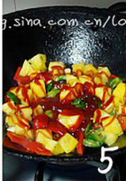 4. 热锅中,放入少许油,倒入青红椒炒香,倒入菠萝翻炒至出汁。