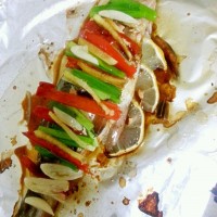 2. 烤箱200度烤6--8分钟,观察鱼尾和鱼皮微焦,拿出,将葱,姜,蒜,小红椒切丝