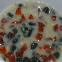 4. 把切好的皮蛋丁加入剩下的三分之一蛋白液里,放入姜末,蒜末搅匀(这是三色之一的黑色部分)