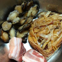 1. 鱿泡发鱼干,鲜鲍鱼洗净,五花肉备用