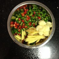 2. 青红朝天椒切成小段,姜拍碎切片,蒜切片备用。
