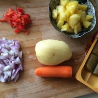 2. 准备辅料:半个洋葱切丁,1个红椒切丁,土豆,胡萝卜刨皮