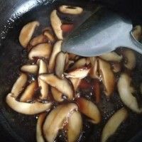 4. 起油锅,下香菇片翻炒。加入蚝油1大匙,酱油1汤匙,糖少许。(因为蚝油本身就有咸味,所以这道菜我没有加盐)。