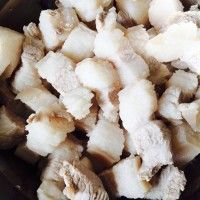 5. 锅中放少许油,倒入五花肉煸炒至颜色微黄。