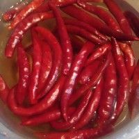 3. 葱切成葱花、泡好的干辣椒切段、蒜粒剥去皮后拍碎、姜刨去皮后拍碎.