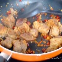 7. 热锅,放油、辣椒、姜碎末、蒜末,中火爆香,然后放去血水的牛腩块、酱油爆炒;
