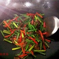 6. 热锅,下适量食用油,倒下蒜薹爆炒片刻。