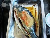 6. 腌制好的鱼加入酱油,撒上花椒粉,孜然粉,辣椒粉均匀地抹在鱼身上。