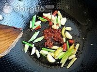 9. 炒锅到油烧热爆香葱姜蒜,辣椒,泡椒。