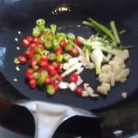 3. 放少量的油,把蒜,葱段爆香,然后放入青红椒圈煸炒。