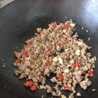 7. 倒入瘦肉,加少量老抽,肉要多炒一下。