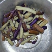 6. 炸好后放一边待用(欧巴买的茄子比较细,如圆茄子或粗点可削去皮)