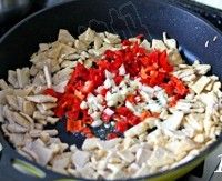 10. 下入红椒和蒜末;