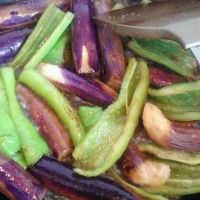 2. 锅热放油下茄子,青椒放盐炒茄子皮有点变色 。