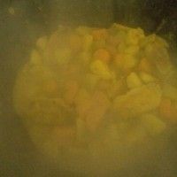 4. 马铃薯和胡萝卜煮好后,把咖喱粒粒和鸡翅一起炒,等咖喱融化后,放入水刚好淹过鸡翅就可以了,和少许糖。