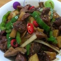 6. 等15分钟左右 酱汁快收干时 放青椒快炒片刻 就可以出锅啦