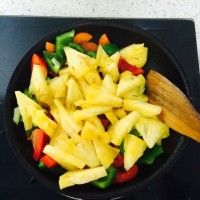 10. 锅中留少许底油,放入蒜粒煸香、放入肉块、青红椒块和菠萝块翻炒