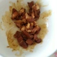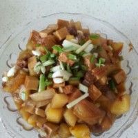7. 土豆半成熟后倒入香干,开始放盐,糖,醋,老抽,豆瓣酱,翻炒致土豆和香干入味后,倒入洋葱和肉丁,翻炒至9成熟就可以倒入火腿丁进行翻炒,至完全入味了,就可以撒上蒜块了,蒜块撒好后,关掉火将菜盛入容器内,均匀撒上葱段就大功告成了