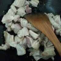 2. 炒锅烧热,放入食用油。油热后放入五花肉块快速煸炒,主要是怕粘锅。