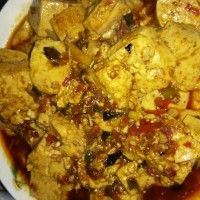 2. 加入清水后。把切好的豆腐快入锅,再加一勺自制辣椒沫,没有不放也可以。白糖,盐。