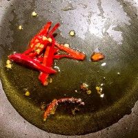 2. 热油放入干辣椒丝煸炒出香味。