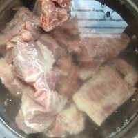 2. 排骨捞出控水,加料酒,生抽,玉米淀粉抓匀腌制一小时以上。