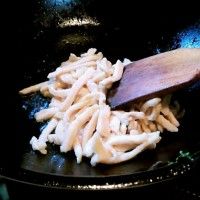 3. 锅内放油,热锅,凉油放入鸡丝,翻炒成型,变色称出