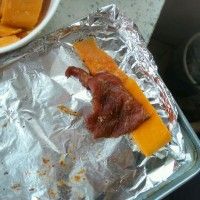 5. 接下来是漂亮的摆盘。烤盘铺锡纸,一片南瓜一片肉。