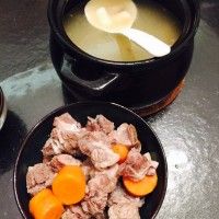 6. dang dang dang,因为老公不太喜欢吃白肉,因此我就参照广东人的吃饭,将汤中的料都盛入盘中,用另一个小碗调蘸汁(少许生抽,麻油,再淋上一勺排骨的鲜汤)这样一菜变两菜了,饭前先来碗鲜汤,排骨可以当菜蘸汁食用,关键原汁原味,健康纯鲜!