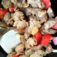 6. 油锅六成热额,入葱姜蒜和洋葱炒出香味,倒入牛肉翻炒三分钟。