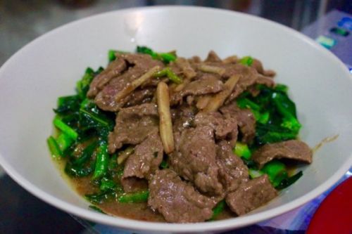 2. 牛肉先切片,加少许盐、酱油、油和切好的姜丝拌匀腌好,炒完芥兰就下锅,翻炒变色后,用冷水兑生粉和沙茶酱倒入锅中略煮到冒泡就出锅,淋到芥兰上面,完成!