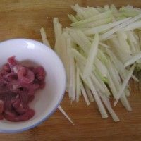 2. 里脊肉洗净切丝,放料酒1茶匙、淀粉1茶匙、食用油1茶匙,搅拌均匀;