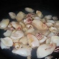 2. 锅里烧开水,把清理好的小鱿鱼倒进去焯那么一两秒就捞出来。焯时间长了鱿鱼肉就老了,不焯炒的时候鱿鱼会出很多水。