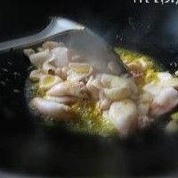 3. 锅里加油,烧热,葱姜末爆香,将鱿鱼倒入翻炒,加盐和少许酱油调味,