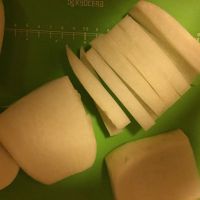 2. 白萝卜对半切,个人喜欢一条条的、不喜欢一片片、以下是切法