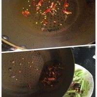3. 干锅放花生油烧热,放花椒和辣椒炸香。泼在萝卜条上。