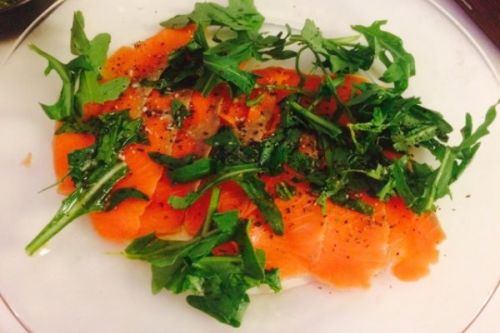 5. 最后将混合好的酱汁淋上三文鱼再撒上少许芝麻菜装饰。淋上酱汁的烟熏三文鱼口感更加赭喱柔滑,搭上柠檬汁清香解腻,非常简单的开胃前菜。
