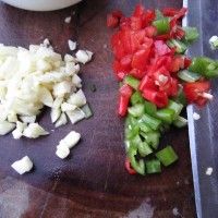 2. 蒜、辣椒切碎、切丁。