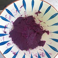做法图解1:紫薯蒸熟趁热压成紫薯泥,加入炼奶拌均匀,太干加适量牛奶。