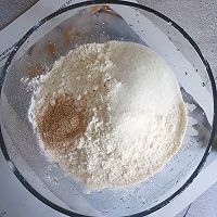 做法图解2:和面盆加面粉、细砂糖、酵母拌匀。