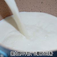做法图解7:奶锅内导入纯牛奶,加入白糖和白凉粉,用小火加热到冒泡泡,要开但是没有开的状态,即可关火